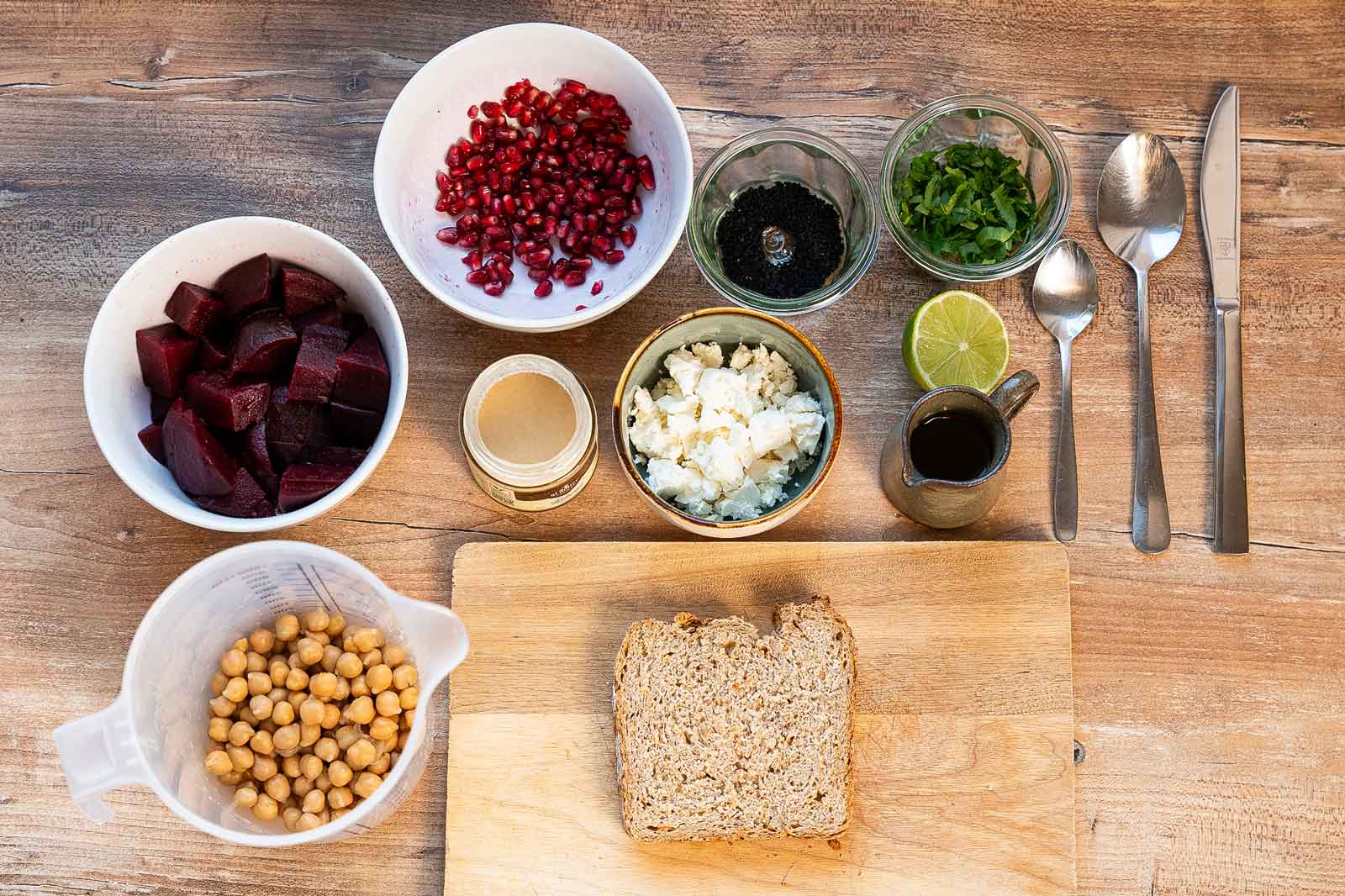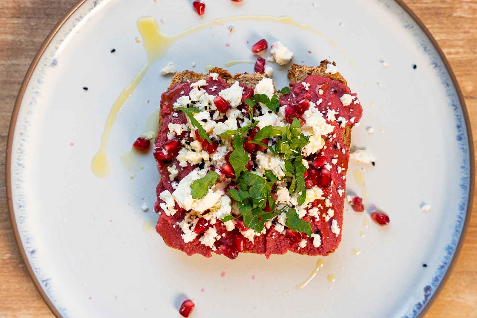 Eine nicht zu dünne Scheibe vom Brot abschneiden und den Rote Beete-Hummus großzügig darauf verteilen. Nach Belieben mit Feta, Granatapfelkernen, Petersilie und Schwarzkümmel garnieren.