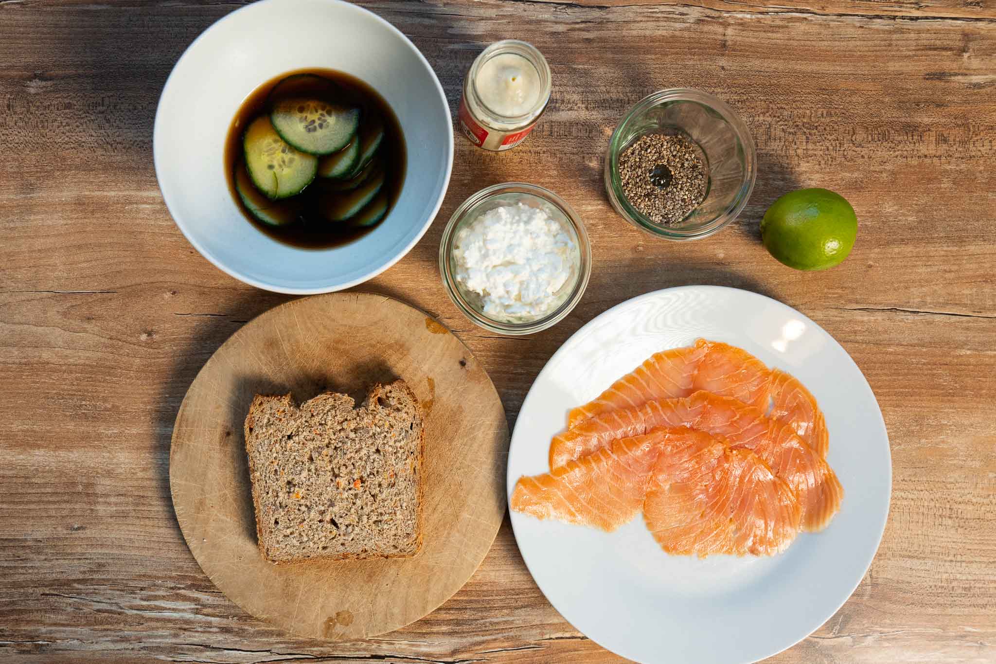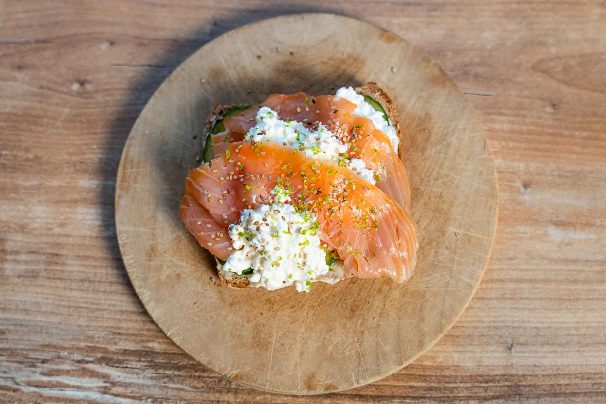 Die Brotscheibe mit Sahne-Meerrettich bestreichen, mit Gurkenscheiben belegen und anschließend den Lachs im Wechsel mit dem körnigen Frischkäse darauf anrichten. Mit etwas Sesam und Limettenabrieb garnieren.